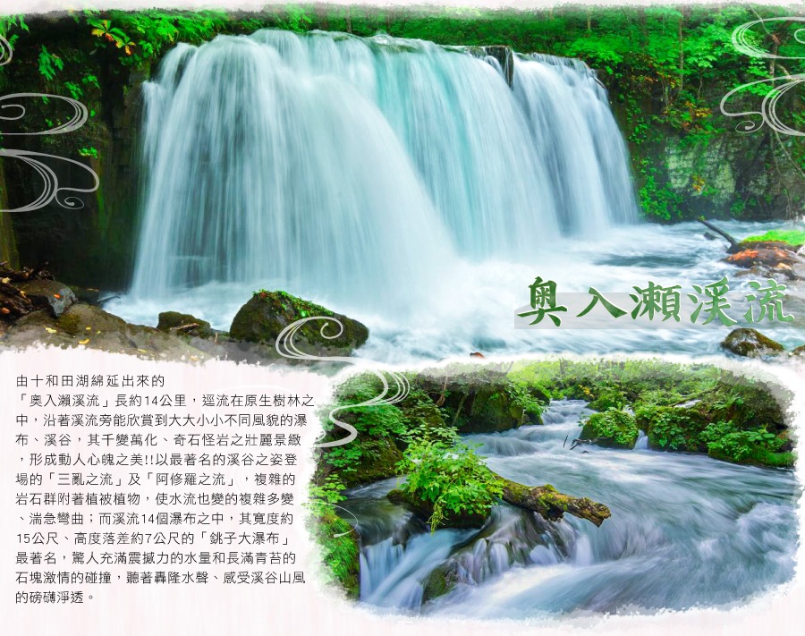 子之口至燒山綿延14公里之十和田樹海、溪流、岩石、瀑布組成千變萬化景緻,是東北景色之最的『奧入瀨溪流』散步,無窮的樹木、變化豐富的水流、天然和奏的水聲、吸收芬多精、享受漫步於森林浴裡;同時也是日本人於秋楓季節最喜愛的散策之地,會使您心曠神怡,輕鬆悠遊。