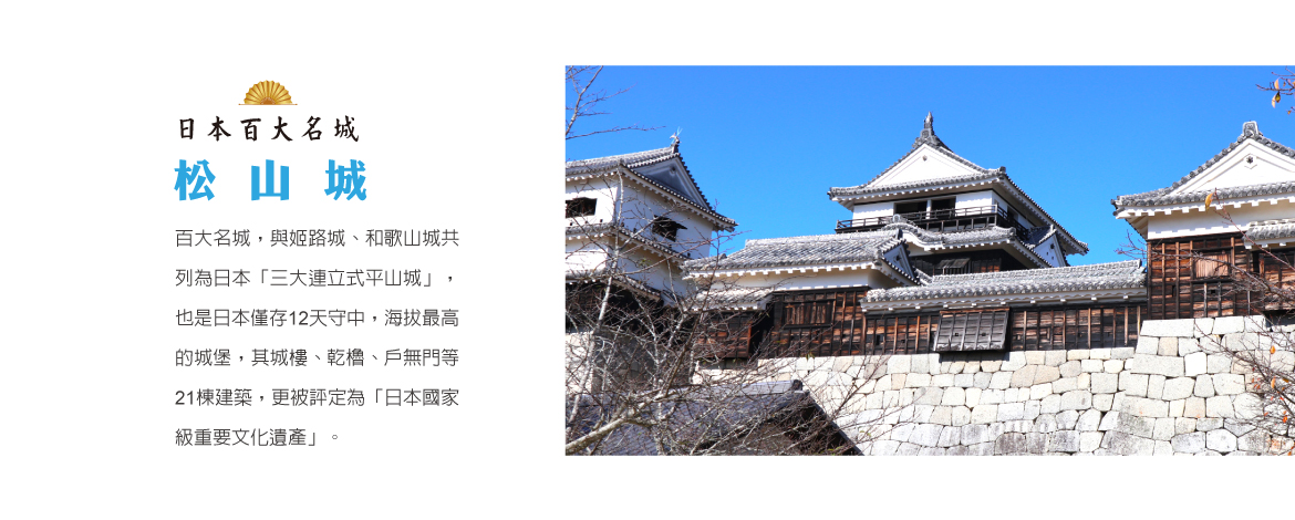 【松山城】百大名城,與姬路城、和歌山城共列為日本「三大連立式平山城」,也是日本僅存12天守中,海拔最高的城堡,其城樓、乾櫓、戶無門等21棟建築,更被評定為「日本國家級重要文化遺產」。除了大天守閤外還有數個小天守閤亙相連接,看起來更為壯觀,在天守閤的最上層可以360度欣賞整個城市的風景。
