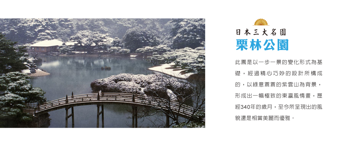 【栗林公園】占地凌駕日本三大名園而聞名全國。總面積23萬坪,園內有6個池泉和13座假山,為日本式的迴遊式庭園。此園是以一步一景的變化形式為基礎,經過精心巧妙的設計所構成的,以綠意蒼蒼的紫雲山為背景,形成出一幅極致的東瀛風情畫,歷經340年的歲月,至今所呈現出的風貌還是相當美麗而優雅。