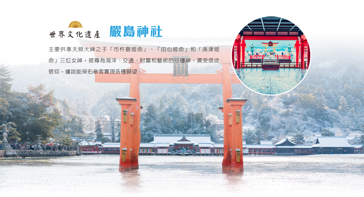 【嚴島神社】嚴島神社建在被日本人稱為「神之島」的嚴島之上,是日本最有名的海上神社,相傳是由豪族佐伯鞍職創建於推古天皇元年。主要供奉天照大神之子「市杵島姬命」、「田心姬命」和「湍津姬命」三位女神,這三位女神被尊為海洋、交通、財富和藝術的守護神,廣受信徒敬仰,據說能保佑參客實現各種願望。
