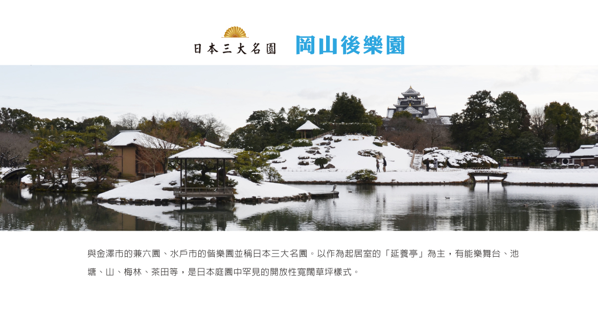 【岡山後樂園】興建於約300年前,是日本具代表性的諸侯庭園,和金澤市的兼六園、水戶市的偕樂園並稱日本三大名園,總面積約13公頃,整個庭園的設計採借景法之池泉迴遊式庭園,以操山、岡山城做為背景,唯心山及澤池為中心所建的一座林泉迴遊式庭園。座落於園內中心的流店,特意將流水通過建築物下方,可於此欣賞水流的變化,成為歷代藩主靜心思考的絕佳場所。