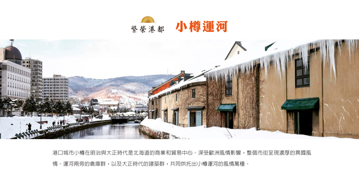 【小樽運河】面臨日本海,從明治時代起就是國際港都,深受歐洲風情影響,整個市街呈現濃厚的異國風情,運河兩旁的倉庫群,以及大正時代的建築群,共同烘托出小樽運河的風情萬種。爾後參觀素有玻璃工房盛名的【北一硝子館】,為代表小樽的玻璃工藝店,展示全世界最精緻的玻璃工藝品與油燈。還有地標之一的【音樂盒博物館】,更是不可錯過的景點,別忘了在鐘塔前照張紀念照再入館參觀喔!博物館挑高9m充滿開放感的建築,展示販賣著獨創商品到高級音樂盒約有15,000件作品。而【銀之鐘咖啡館】是一棟西式洋樓,銀之鐘原是指在北海道列車在小樽開通時,車站上所使用的鐘,稱之為「開拓の鐘」,不論甚麼時候,鐘受到光線的反射照耀,永遠都閃著銀色的光,因此取銀之鐘的店名也有小樽市代表意思。