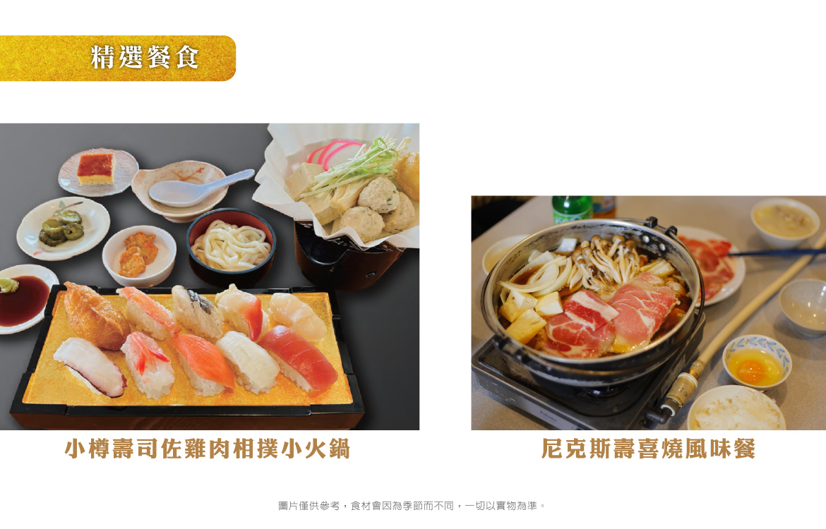 ※素食旅客請注意:由於疫情後日本餐廳人力短缺,廚師主要工作為提供餐廳常規餐食,對於素食恐無法精心料理,故須以餐廳所提供之內容為主,餐廳不接受現場指定或增加菜餚(例如炒一盤青菜等),如擔心料理不合口味,敬請旅客自備罐頭素食備用,敬請理解配合,謝謝。