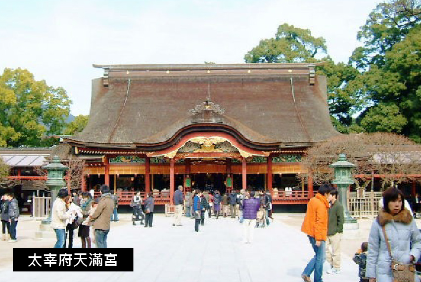 【太宰府天滿宮】為日本一萬三千座天滿宮的總殿,寶物殿內有國寶翰苑,歷史館內記載菅原道真公一生的事蹟,庭園內則有一株千年樟木、六千株梅樹及三萬株菖蒲花,美麗多姿。桃山時代的山型牆建築,使其成為日本重要的文化財產,寺外更有一條將近2000公尺長的石道,兩側均是土產精品及飲食店,讓您眼花撩亂。