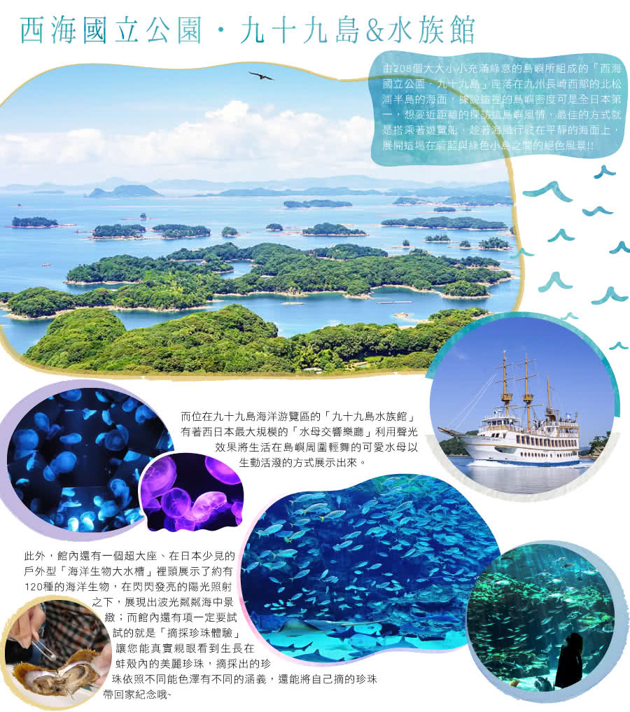 ※九十九島遊覽船,隨日期及季節性會調整運行時間及班次,實際時間參考九十九島遊覽船官網,行程順序也會因配合班次而有所調整,並以說明會資料為準;如遇天候不可抗力之因素或定期維修時、預約滿席,並退回團體料金每人日幣1500,兒童每人日幣1000,(不含嬰兒)敬請了解,謝謝。
