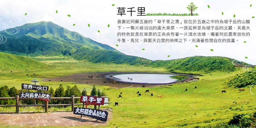 草千里為直徑長達一公里的大草原,形狀像一個淺淺的大盤子,草原中央有一個大湖,正是放牧的好場所,夏日裡可以領略到放牧風景,中央處的兩汪水池為周圍的景觀錦上添花,增添情趣,牛馬在濃綠的草原上悠然自適地吃草,恬靜的草原牧景令人心曠神怡,冬季這兒則是個很好的滑雪場。
