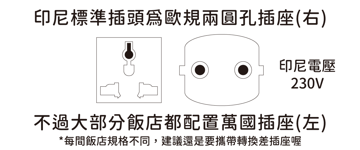 網路/電壓:插頭為歐規兩孔圓頭(220V),出發前記得準備轉接頭。網路推薦購買印尼SIM卡或WiFi分享器。